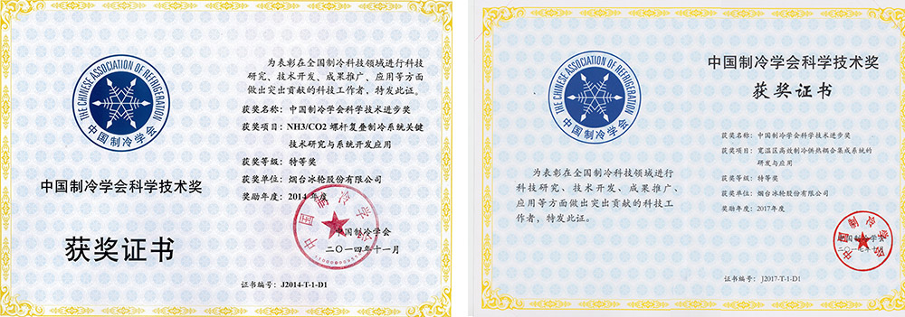 2014年-2017年,NH3/CO2螺桿復(fù)疊制冷技術(shù)與寬溫區(qū)冷熱耦合系統(tǒng)技術(shù)先后榮獲中國(guó)制冷學(xué)會(huì)科技進(jìn)步特等獎(jiǎng)。