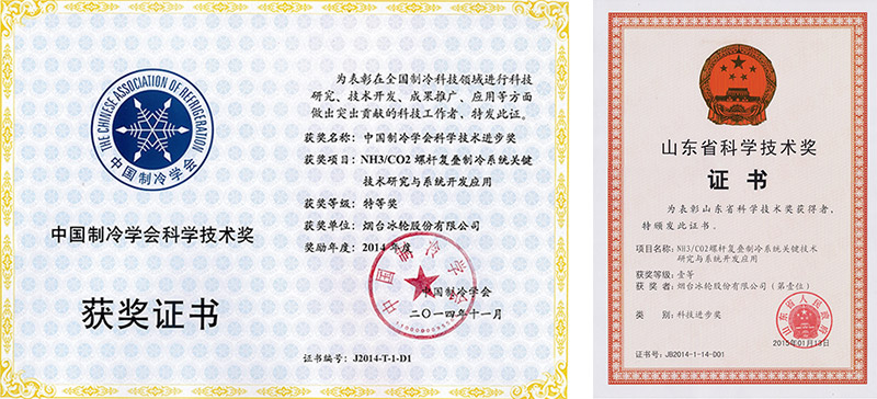 “NH3/CO2螺桿復(fù)疊制冷系統(tǒng)關(guān)鍵技術(shù)研究與系統(tǒng)開發(fā)應(yīng)用”獲山東省科技進(jìn)步一等獎(jiǎng)和中國(guó)制冷學(xué)會(huì)科技進(jìn)步特等獎(jiǎng)。