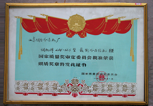1988年11月,煙機(jī)牌4AV-12.5型氨制冷壓縮機(jī)獲國(guó)家質(zhì)量銀質(zhì)獎(jiǎng)?wù)隆?/p>